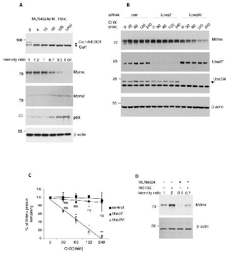 Figure 1. Prolonged inhibition of the NEDD8 pathway promotes Mdmx degradation. (A) A375 melanomas cells were treated with increasing concentrations of the NEDD8 inhibitor MLN4924, and total cell extracts were analysed using Western blotting for the indicated proteins. (B) Half-life experiment for Mdmx in A375 cells upon knockdown of the NEDD8 E2-conjugating enzymes Ube2F and Ube2M using cycloheximide (30 μg/mL). (C) Quantification for the experiment presented in B. Values represent the mean of three independent experiments ± SD. p-values * < 0.05, ** < 0.01 by Student’s t-test. ns: non-significant. (D) A375 cells were treated with MLN4924 (1 μM, 15 h) and MG132 (30 μM, 4 h), and cell extracts were used for Western blotting.