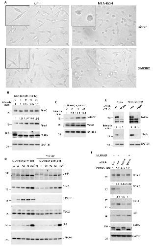Figure 3. Mdmx stabilises RhoA and is required for the morphological changes induced upon NEDDylation inhibition in metastatic cell lines. (A) MDA-MB-231 cells were transfected with either control or Mdmx siRNAs before treatment with MLN4924 (0.5 μM). Cell morphology was monitored 24 h post-treatment. (B,C). A375 cells were treated as indicated, and extracts were used for Western blotting using indicated antibodies. (D) A375 cells were treated with MLN4924 and the RhoA/ROCK inhibitor Y27632 (10 μM, 2 h) as indicated, and total cell extracts were used for Western blotting using indicated antibodies. (E) A375 and MDA-MB-231 cells were transfected with Mdmx siRNAs for 72 h before cells were harvested, and extracts were used for Western blotting using indicated antibodies. (F) A375 cells were transfected with control or Mdmx siRNAs and treated with MLN4924 (0.5 μM) 24 h before harvesting (48 h in total). Western blotting on cell extracts was performed as indicated.