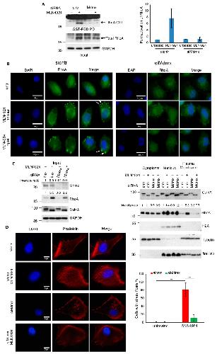 Figure 5. Mdmx is required for RhoA activation at the plasma membrane. (A) A375 cells transfected with control or Mdmx siRNAs were treated with MLN4924 (1 μM, 15 h), and extracts were used in a GST-Rhotekin pull-down to isolate the active GTP-loaded state of RhoA. Eluates and total cell extracts were used for Western blotting. The graph represents the mean of two independent experiments ± SD of the fold activation of RhoA (Materials and Methods). (B) A375 cells transfected with control or Mdmx siRNAs were treated with MLN4924 (15 h) before the analysis of RhoA using immunofluorescence. Arrows indicate the localisation of RhoA in the plasma membrane upon MLN4924 treatment. (C) Similar experiment as in A (MLN4924, 1 μM, 15 h), but cells were used for the isolation of plasma membranes. Total cell extracts (left panel) and isolated fractions (right panel) were used for Western blot analysis. (D) Experiment performed as in (A), using low doses of MLN4924 (100 nM, 15 h) to prevent the induced morphological changes, and cells were used for Phalloidin staining to monitor stress fiber formation. Right panel is the quantification of the experiment performed in (D), using 100 cells/condition (n = 3), ±SD. p-values, ** < 0.01.