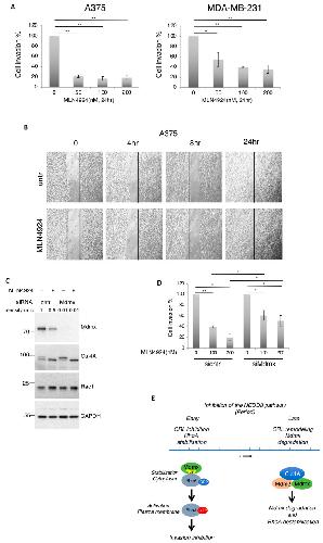 Figure 8. Mdmx prevents cell invasion but not 2D cell migration of metastatic cells. (A) A375 and MDA-MB-231 cells were used in a 3D cell invasion assay and the effect of NEDD8 inhibition was tested as described in Materials and Methods. Values represent the mean of 4 independent experiments ± SD. p-values * < 0.05, ** < 0.01 by Student t-test. (B) Similar experiment was performed to test the effect of NEDD8 inhibition (MLN4924, 1 μM) on 2D cell migration. Black lines indicate the gap between cells filled over the indicated period of time. (C) A375 cells transfected with control or Mdmx siRNAs were treated with MLN4924 (1 μM, 15 h) as indicated and cell extracts were used for Western blot analysis. (D) Similar experiment as in A, but 36 h prior to MLN4924 treatment, A375 cells were transfected with control or Mdmx siRNAs. Values represent the mean of four independent experiments ± SD. p-values * < 0.05, ** < 0.01 using Student t-test. (E) Transient inhibition of NEDDylation and CRL inactivation results in RhoA stabilisation and activation that depends on Mdmx. Prolonged NEDD8 inhibition allows for the formation of complexes between non-NEDDylated Cullin4A (inactivation of CRL4A) and E3-ligases (Mdm2) that promote the degradation of Mdmx and subsequent destabilisation of RhoA.