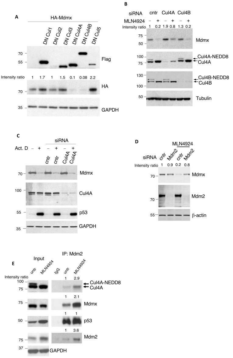Figure 2. Mdmx degradation induced upon NEDDylation inhibition requires inactive Cullin4A and Mdm2. (A) A375 cells were co-transfected with different dominant negative-expressing Flag-tagged Cullin constructs (3 μg) and HA-Mdmx (3 μg). After 48 h post-transfection, total cell extracts were used for Western blotting as indicated. (B) A375 cells were transfected with either control, Cullin4A, or Cullin4B siRNAs followed by MLN4924 treatment (1 μM, 15 h). After 48 h post-transfection, cell extracts were used for Western blotting against the indicated proteins. (C) Experiment performed as in B using Actinomycin D treatment (5 nM, 15 h). (D) A375 cells were transfected with Mdm2-targeting siRNAs and treated as indicated (MLN4924, 1 μM, 15 h), before extracts were analysed by Western blotting using indicated antibodies. (E) A375 cells were treated with MLN4924 (1 μM, 6 h, conditions where Mdmx levels are not significantly affected) and extracts were used for immunoprecipitations using 4B2 anti-Mdm2 antibody. Western blot analysis on immunoprecipitates and total cell extracts was performed with the indicated antibodies.