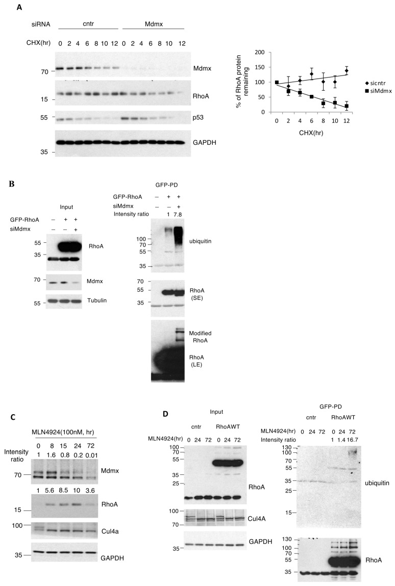 Figure 4. Mdmx is required for RhoA stabilisation and activation induced upon NEDDylation inhibition. (A) A375 cells transfected with control or Mdmx siRNAs for 72 h were then treated with cycloheximide (30 μg/mL), cells were harvested at the indicated times before Western blot analysis of cell extracts. Right graph represents the quantification of RhoA levels in the experiment. Values represent the mean of three independent experiments ± SD. (B) A375 cells transfected with control or Mdmx siRNAs were then transfected with control empty vector or wild type GFP-RhoA constructs as indicated. To prevent RhoA degradation, proteasome inhibitors (MG132, 30 μM, 5 h before harvesting) were used. Upon GFP-RhoA pull-downs (PD) the eluates were blotted with anti-ubiquitin antibodies. SE: Short exposure, LE: Long exposure. (C) A375 cells were treated with MLN4924 (100 nM) for the indicated times, and cell lysates were analysed using Western blotting as indicated. (D) A375 cells were transfected with either control or GFP-tagged wild type RhoA and treated with MLN4924 (100 nM) for the indicated times. To prevent RhoA degradation, proteasome inhibitors (MG132, 30 μM, 5 h before harvesting) were used for all indicated time points. GFP trap pull-down (right panel) was performed, and RhoA ubiquitination was analysed using Western blotting.