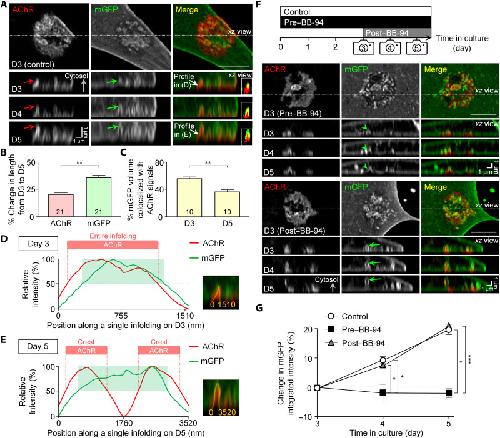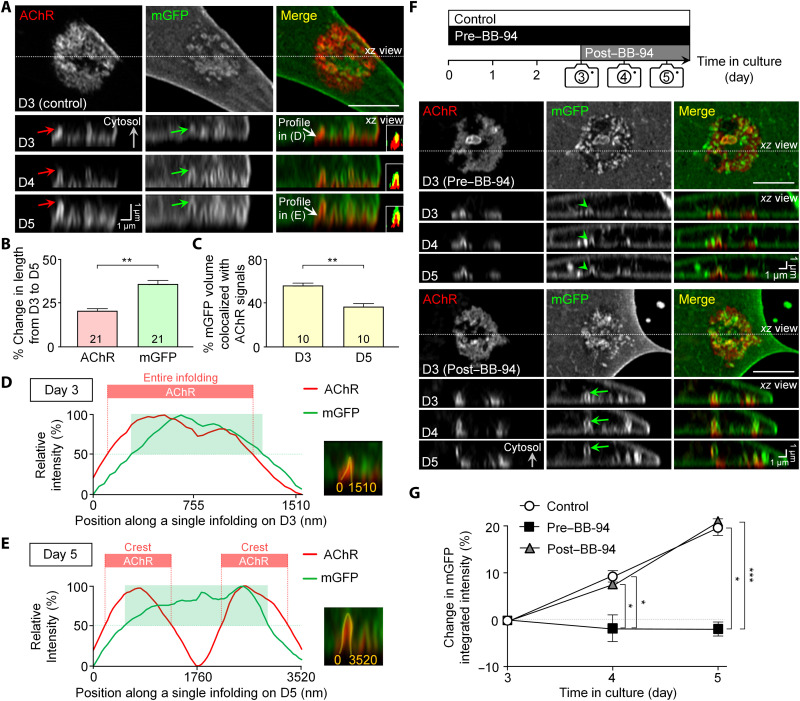 Fig. 2. ECM remodeling is required for the progressive elongation of the same membrane infoldings monitored over time.(A) Representative Airyscan confocal images showing the progressive elongation of membrane infoldings at the same aneural AChR clusters between days 3 and 5 in cultures. Red and green arrows, the progressive elongation of a membrane infolding; white arrows, the membrane infolding for generating line profiles in (D) and (E). Insets: Pseudocolor merge images indicating lower AChR abundance at the tip (trough) of membrane infoldings at later time points. (B and C) Quantification showing the progressive increase in the lengths of AChR and mGFP-labeled membrane infoldings (B) and the reduced degree of their colocalization (C) between days 3 and 5 in cultures. (D and E) Line profile plots showing the relative intensities of AChR (red) signals along mGFP-labeled membrane infoldings (green) indicated in (A) on day 3 (D) and day 5 (E) muscle cultures. Shaded regions were highlighted by a 50% cutoff intensity. Yellow lines, the same single-membrane infolding identified on days 3 and 5 for generating line profiles. (F and G) Experimental timeline, representative confocal images (F), and quantification (G) showing the differential effects of BB-94 pre- and post-treatment on membrane infolding maintenance and elongation in the same aneural AChR clusters over 5 days in culture. Arrowheads, the inhibition of membrane infolding elongation by BB-94 pre-treatment. Arrows, the progressive elongation of a membrane infolding in BB-94 post-treatment group. Scale bars, 5 μm (unless stated otherwise). The numbers indicated in the bar regions represent the total numbers of membrane infoldings (B) or muscle cells (C) quantified from three independent experiments. n = 17 (control); n = 17 (pre–BB-94); n = 21 (post–BB-94) muscle cells from three independent experiments (G). *P ≤ 0.05, **P ≤ 0.01, and ***P ≤ 0.001 [Student’s t test (B) and (C) and two-way ANOVA with Dunnett’s multiple comparisons test (G)]. |