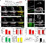Fig. 3. Time-dependent elongation of membrane infoldings exhibits differential localization of AChR and AChE along the length of membrane infoldings.(A) Maximal and orthogonal projection of Airyscan confocal z-stack images showing the spatial enrichment of AChE along the entire membrane infolding region at aneural AChR clusters in both 3- and 5-day-old live muscle cells. Arrows, the spatial distribution of AChR and AChE along the CellMask-labeled membrane infoldings in the orthogonal views. (B and C) Line profile plots showing the relative intensities of AChR (red), AChE (green), and CellMask (magenta) signals at aneural AChR clusters in 3- (B) and 5-day-old (C) muscle cells. The spatial distribution of AChR and AChE along the CellMask-labeled membrane infolding was highlighted in shaded regions by a 50% cutoff intensity. Yellow lines in the insets indicate the regions of interest (ROIs) for generating line profiles. Scale bars, 5 μm (unless stated otherwise). |