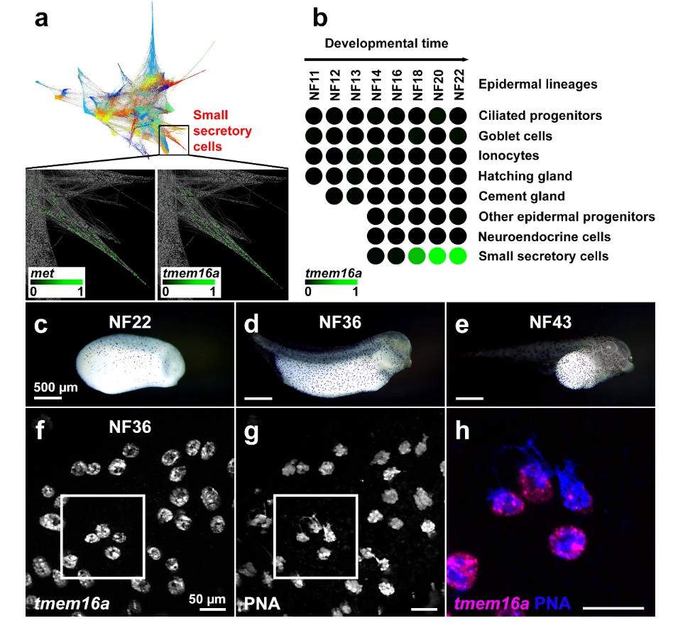Fig. 1X. tropicalis tmem16a is expressed in SSCs in the tadpoleskin. (a–b) In a developmental time series of single-cell transcriptomes in X. tropicalis embryos from NF8-NF22, an SSC lineage (highlighted in red) was identified (a, upper). An expanded view (black box) examining gene-specific expression in this SSC lineage reveals expression of met (a, lower left; marking this SSC lineage) and of tmem16a (a, lower right). Within epidermal lineages, tmem16a expression is present in the SSC lineage from NF18 but absent from other epidermal lineages from differentiation to NF22 (b). Each circle represents a developmental stage in a specific epidermal lineage. Scale bars: colour intensity represents normalised expression level from undetectable (0) to maximum expression (1) within the entire dataset. (c–e) Chromogenic in situ hybridisation for tmem16a at stages NF22 (c), NF36 (d) and NF43 (e) reveals punctate expression throughout the skin, matching typical SSC distribution. (f–h) Fluorescent in situ hybridisation for tmem16a (f) and dual staining with the SSC vesicle marker PNA (g) confirms that tmem16a is expressed in SSCs (merged and expanded from white box in h).