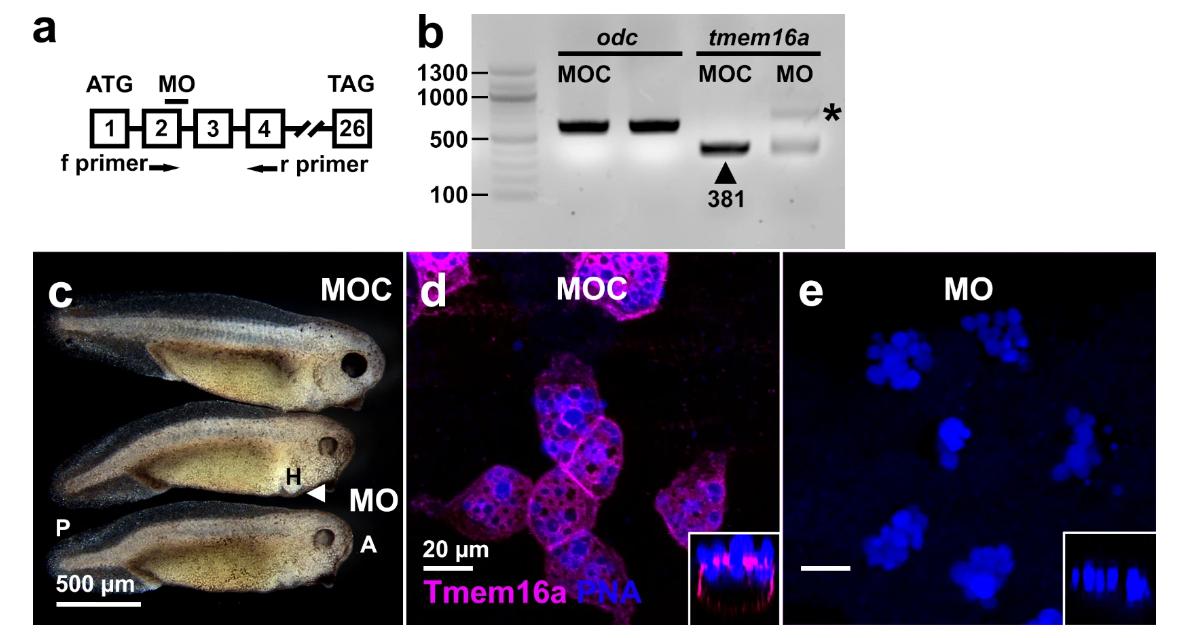 Fig. 5Knockdown of X. tropicalis Tmem16a. (a) A schematic diagram (not to scale) showing a MO targeted to the splice donor site of exon 2 of X. tropicalis tmem16a pre-mRNA. Primers used to amplify the resulting mRNA fragment via RT-PCR species are labelled f and r. An arrow indicates the position of a premature termination codon (PTC) in intron 2. Start (ATG) and termination (TAG) codons are indicated in exons 1 and 26, respectively. (b) RT-PCR analysis of tmem16a mRNA in embryos injected with MOC and tmem16a splice MO demonstrate a marked reduction of normally-spliced tmem16a mRNA (arrowhead; expected size 381 base pairs in length) in the latter, despite equal loading (amplification of the housekeeping mRNA odc was equivalent in both samples). A larger mRNA species resulting from disrupted splicing is evident in MO-injected tadpoles (asterisk). No other amplicons were detected. Fragment sizes were compared against a standard DNA ladder (left lane; sizes indicated in base pairs). (c) Morphant embryos have mild anterior-posterior (A, P) defects, delayed head development and small heart (H) edemas (arrowhead). (d–e) Injection of tmem16a splice MO caused a complete loss of Tmem16a protein in the plasma membrane of SSCs in the tadpoleskin, marked by PNA staining of the vesicles. Orthogonal views (insets) demonstrate this loss at all cellular planes. PNA staining indicates that SSC development is typical in morphants.