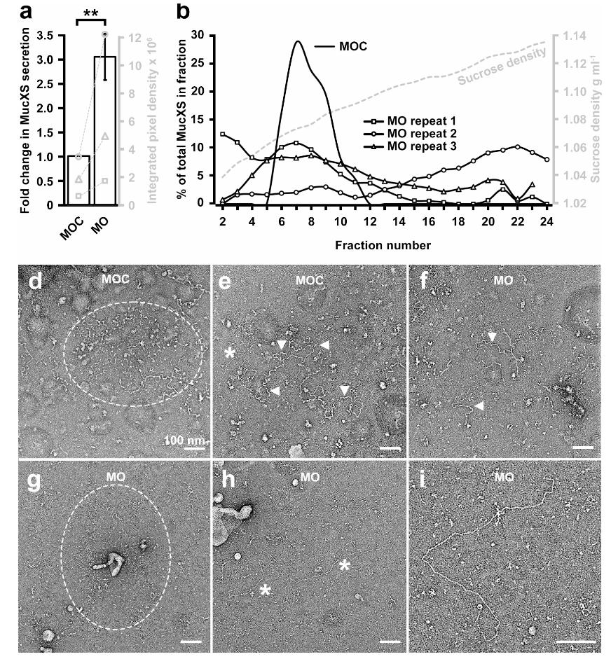 Fig. 6X. tropicalis Tmem16a regulates mucin secretion and remodelling. (a) Tmem16a depletion results in significantly increased MucXS secretion (mean 3-fold increase) from the tadpoleskin under ionomycin-induced conditions. Paired data from three biological replicates is shown on the secondary axis (grey). The Shapiro-Wilk test did not show a significant departure from normality for raw data from either MOC- or MO-injected embryos. Ratio paired t-testing identified a significant difference in MucXS signal between MOC- and MO-injected embryos, p = 0.0062. (b) MucXS secreted from MOC-injected tadpoles forms a discrete density peak (MOC; typical experiment) while MucXS secreted from Tmem16a morphant tadpoles is distributed across a wide density profile (MO repeats 1–3). Sucrose density from a typical experiment is indicated on the secondary axis (grey). (d–e) Mucins secreted from MOC-injected tadpoles are detectable as compact (d) or semi-expanded (e) forms. (f–i) Mucins secreted from Tmem16a morphant tadpoles are occasionally evident in semi-expanded form (f) or as thin strands aggregating with amorphous strutures (g). The majority of secreted mucins appear as linear molecules (h-i).