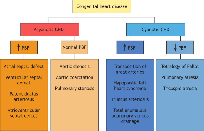 Fig. 2. Classification of CHD into acyanotic and cyanotic CHD, and the status of pulmonary blood flow (PBF).