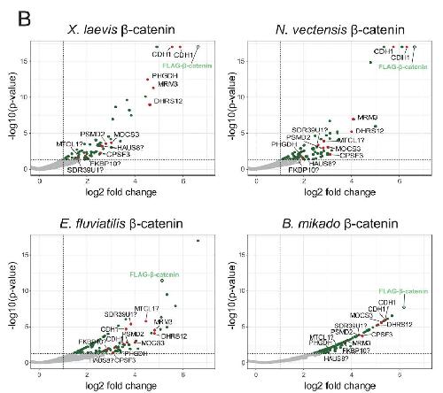 Fig. 4Precipitation of β-catenin interacting proteins. (A) Scheme of our IP-MS analysis of β-catenin protein complexes. (B) Mass spectrometry volcano plots resulting from analysis of enriched metazoan FLAG-tagged β-catenins expressed in Xenopus embryos. High confidence proteins (1% FDR), with a fold abundance ratio ≥ 2 and P < 0.05, were considered “true” interactions |