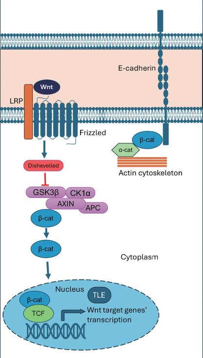Fig. 1Major functions of β-catenin in bilaterians. In signal transduction, in the presence of Wnt ligands, the β-catenin degradation complex is inhibited by Dishevelled. β-catenin accumulates in the cytoplasm and translocates to the nucleus, where it binds TCF and displaces the transcriptional repressor TLE, resulting in gene transcription of canonical Wnt signaling target genes. In structural roles, β-catenin contributes to E-cadherin-mediated cell-cell adhesion by linking E-cadherin to α-catenin, and reinforces cellular structure by binding α-catenin to the actin cytoskeleton |