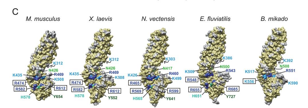 Fig. 2Primary and 3D structures of nonbilaterian β-catenins. (A) Overview of phylogeny and structure of β-catenins of early-branching (nonbilaterian) metazoans and ARM6 protein of the unicellular sister taxon, Choanoflagellata. (B) Domain organizations of β-catenin proteins. Metazoan β-catenins show a high degree of conservation of the central region, GSK3β/CK1α phosphorylation sites, and αE-catenin binding sites. At the C-terminus, motif A is conserved in only Bilateria and Cnidaria, whereas motif B is shared among all metazoan lineages, except for Ctenophora. In the choanoflagellate, Salpingoeca rosetta, possible GSK3β phosphorylation sites (S33/T41) were identified. (B) Surface depictions of β-catenin homology structural models were compared with mouse β-catenin. This confirmed that the three crucial arginine residues (dark blue) of nonbilaterians were localized similarly to mouse and Xenopus β-catenins. K556, R551, and K590 of B. mikado β-catenin were located at positions corresponding to mouse β-catenin R474, R469, and K508, but the R582, H578, R612, and Y654 assembly of mouse β-catenin is completely absent in B. mikado β-catenin. Structures visualized using UCSF Chimera software |