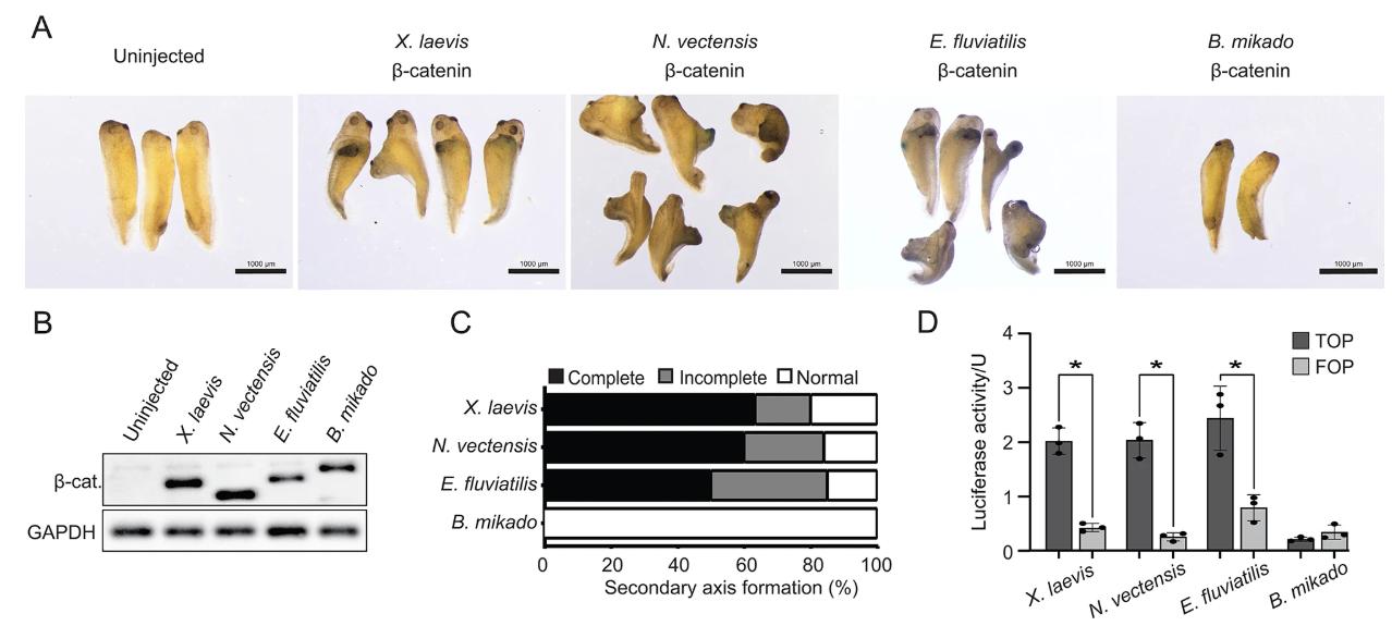 Fig. 3Xenopus secondary axis induction by nonbilaterian β-catenins. (A) Cnidarian (N. vectensis) and poriferan (E. fluviatilis) β-catenins (100 pg mRNA) induced a secondary body axis similar to that induced by Xenopus β-catenin. Ctenophore (B. mikado) β-catenin showed no inductive activity. (B) Western blot analysis of Flag-tagged β-catenins confirmed the expression of nonbilaterian β-catenin proteins in Xenopus embryos. (C) The majority of secondary body axes induced by injection of X. laevis (n = 24), N. vectensis (n = 20), and E. fluviatilis (n = 18) β-catenin mRNAs (100 pg) were complete (the second axis had a pair of eyes and a cement gland). This was followed by incomplete axis inductions in which head features were not fully developed. Secondary axes were not observed in embryos injected with B. mikado β-catenin mRNA (100 pg) (n = 19). (D) Expression of X. laevis, N. vectensis, and E. fluviatilis FLAG-tagged β-catenin mRNA (100 pg) in Xenopus embryos resulted in a significant increase in β-catenin TOPflash activity. No detectable level of TOPflash activation was observed by expression of B. mikado β-catenin. Asterisks denote statistical significance P < 0.0001 (Two-way ANOVA). This result was reproduced in two independent experiments |