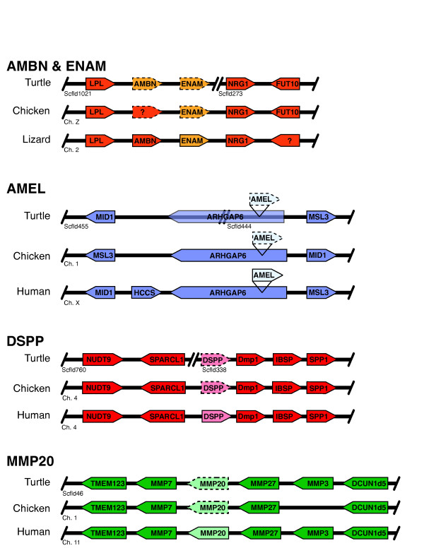Figure 4. Conserved syntenic regions containing tooth-specific genes across toothed (human, anole) and edentulous (turtle, chicken) vertebrates. AMBN and ENAM are in a reptile-specific chromosomal region, precluding the use of human as a reference sequence for these genes. Dashed outlines indicate pseudogenization.