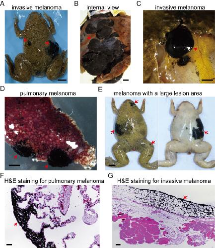 Figure 4. cdkn2b-/-/tp53-/- Xenopus tropicalis melanoma demonstrates distant metastasis. (A) A 30-month-old cdkn2b-/-/tp53-/- Xenopus tropicalis spontaneously developed invasive melanoma, which has exhibited distal metastasis. (B) An internal representation of this invasive melanoma, indicated by the red arrow on the right side of Panel (A), reveals melanoma cells proliferating extensively, forming darkly pigmented tissue surrounded by non-pigmented growths. (C) The presence of distant metastasis of the invasive melanoma is highlighted by the red arrow on the left side of Panel (A), with the cancer spreading to the corresponding subcutaneous dorsal fat tissue. (D) Two distinct sites of pulmonary melanoma lesions have been identified in the lungs of Xenopus tropicalis, as depicted in Panel A. (E) The characteristic pathological features of 30-month-old cdkn2b-/-/tp53-/- Xenopus tropicalis melanoma include large lesion areas, irregular shapes, and multiple lesion sites. Four out of 13 spontaneously generated melanomas in cdkn2b-/-/tp53-/- Xenopus tropicalis exhibit these traits. (F) and (G), Representative hematoxylin and eosin staining results from paraffin-embedded tissue sections of pulmonary melanoma samples (Panel D) and melanoma samples metastasized to subcutaneous dorsal fat tissue (Panel C) are shown, respectively. The images display representative staining results from 10 tissue sections. The red arrow indicates the location of the melanoma lesion. Scale bars: 5 mm for (A) and (E), 1 mm for (B-D), 50 μm for (F) and (G). |