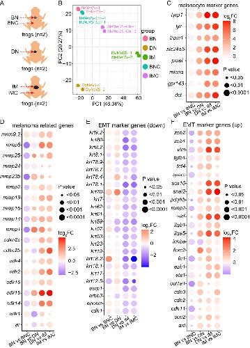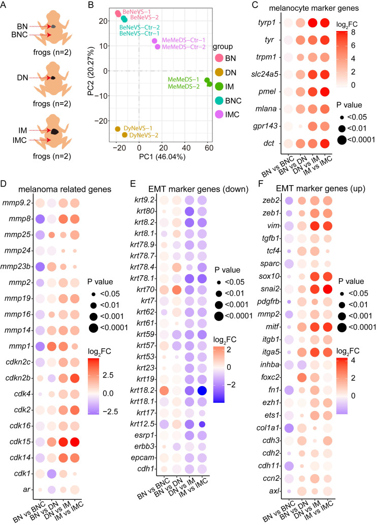Figure 5. cdkn2b-/-/tp53-/- Xenopus tropicalis melanoma undergoes epithelial-to-mesenchymal transition (EMT) during its progression. (A) Bulk RNA-seq sampling details during the evolution of melanoma in 18-month-old cdkn2b-/-/tp53-/- Xenopus tropicalis. Due to the limited availability of cdkn2b-/-/tp53-/- Xenopus tropicalis melanoma samples, the bulk RNA-seq analysis was performed on benign nevi, dysplastic nevi, and invasive melanoma samples, with two replicates per sample type, each derived from lesions on a single frog. BNC, benign nevi adjacent tissues; BN, benign nevi; DN, dysplastic nevi; IM, invasive melanoma; IMC, adjacent invasive melanoma tissues. "n" represents the number of frogs used for sampling. (B) Principal component analysis results of the Bulk RNA-seq data from A, where BeNeVS-Ctr is BNC and MeMeDS-Ctr is IMC. BeVS is BN. DyNeVS is DN. MeMeDS is IM. (C-F) Expression profiles of selected marker genes throughout the melanoma progression. BN vs BNC, BN vs DN, DN vs IM, IM vs IMC indicate comparative analyses between benign nevi adjacent tissues and benign nevi, benign nevi and dysplastic nevi, dysplastic nevi and invasive melanoma samples, adjacent invasive melanoma tissues and invasive melanoma, respectively. |