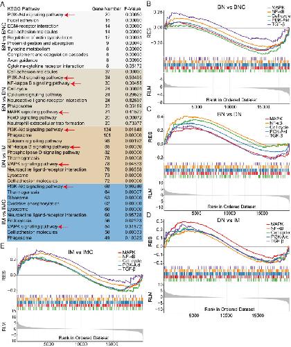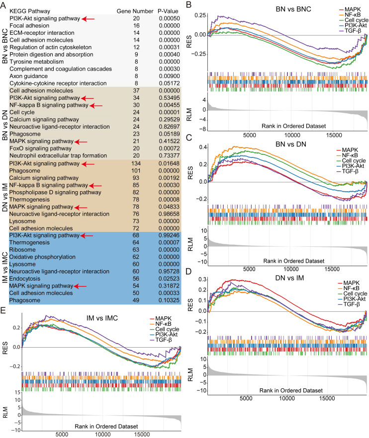 Figure 6. Changes in signaling pathways during the progression of cdkn2b-/-/tp53-/- Xenopus tropicalis. (A) KEGG analysis results of Bulk RNA-seq during the progression of cdkn2b-/-/tp53-/- Xenopus tropicalis, with the red arrow pointing to the focused key signaling pathways. (B-E) In the development of benign nevi in cdkn2b-/-/tp53-/- Xenopus tropicalis, the MAPK, NF-kB, Cell cycle, PI3K-Akt, and TGF-β signaling pathways are downregulated. However, during the progression of benign nevi to malignant melanoma in cdkn2b-/-/tp53-/- Xenopus tropicalis, the MAPK, NF-kB, Cell cycle, PI3K-Akt, and TGF-β signaling pathways are upregulated. BN vs BNC, BN vs DN, DN vs IM, IM vs IMC indicate comparative analyses between benign nevi adjacent tissues and benign nevi, benign nevi and dysplastic nevi, dysplastic nevi and invasive melanoma samples, adjacent invasive melanoma tissues and invasive melanoma, respectively. |