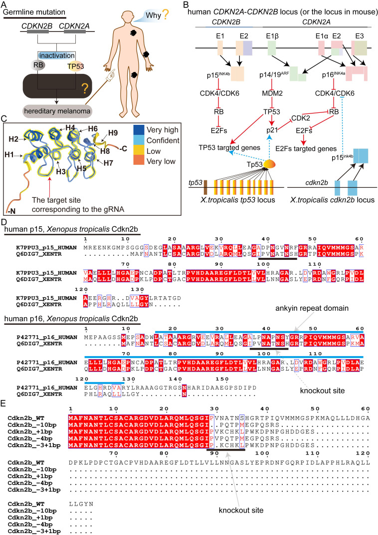 Figure 1. The strategy for modeling human CDKN2A-HM in Xenopus tropicalis. (A) Inactivating mutations of CDKN2A lead to the disruption of the RB and TP53 signaling pathways, which contributes to the onset and progression of CDKN2A-HM. However, the molecular mechanisms that regulate the onset and progression of CDKN2A-HM are still not fully understood. (B) The proteins encoded by the Xenopus tropicalis cdkn2b gene (p15Ink4b) and the tp53 gene (Tp53) govern signaling pathways that are evolutionarily conserved with those regulated by the human CDKN2A-CDKN2B locus, which encodes the proteins P14ARF, P15INK4b, and P16INK4a. (C) Structural analysis reveals conserved sequences in Xenopus tropicalis p15Ink4b and human P16INK4a proteins, with helical structures numbered H1-H9. The conserved domains are highlighted with thick yellow lines. Additionally, spatial information for guide RNA targeting the cdkn2b gene is illustrated in this panel. (D) A comparative analysis was performed between the p15Ink4b (Cdkn2b) encoded by Xenopus tropicalis cdkn2b and the human CDKN2B-encoded p15INK4b (p15), as well as the human CDKN2A-encoded p16INK4a (p16). The diagram illustrates the locations of the ankyrin repeat domain and gRNA target sites. The amino acid sequence data for these proteins were sourced from the UniProt database (https://www.uniprot.org/). (E) The prediction of Xenopus tropicalis Cdkn2b protein for non-triplet mutant Indels. The figure indicates the gRNA knockout sites. |