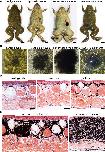 Figure 2. Development of cdkn2b-/-/tp53-/- Xenopus tropicalis melanoma. (A) Representative images of benign nevus, dysplastic nevus, non-invasive melanoma, and invasive melanoma spontaneously generated in 18-month-old cdkn2b-/-/tp53-/- Xenopus tropicalis, with a total of 14 frogs observed. For specific lesion details, please refer to Supplementary Table 2. Red arrows indicate the lesion locations. (B) Enlarged images of the corresponding lesions in Panel (A). Red arrows indicate the lesion locations. Please refer to the scale bar in Panel A for the size of Panel (B). (C) and (D), H&E staining results of dorsal skin samples from the same batch of wild type Xenopus tropicalis and corresponding lesion samples shown in Panel (B). The images display representative staining results from 10 tissue sections. Scale bars: 5 mm for (A), 50 μm for (C) and (D). |