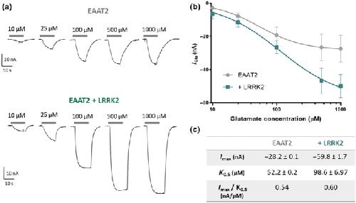 FIGURE 3. EAAT2 kinetic parameters in the presence of LRRK2. (a) Representative traces of concentration‐response in EAAT2. The transport current elicited by increasing glutamate concentration perfused (10, 25, 100, 500 μM, 1 mM) in oocytes expressing EAAT2 alone (top) and with LRRK2 (bottom). (b) Concentration‐response curve fitting with the logistic growth equation (EAAT2: n/N = 6/3; EAAT2 + LRRK2: n/N = 6/3). (c) Tabular presentation of the kinetic parameters I