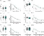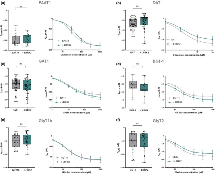 FIGURE 5. (a) (Left) The box plot of the mean of the glutamate (1 mM) transport‐associated current amplitudes elicited in oocytes expressing EAAT1 (n/N = 25/2) and co‐expressing EAAT1 and LRRK2 (n/N = 23/2). (Right) Concentration‐response curve fitting from oocytes expressing EAAT1 (n/N = 8/2) and co‐expressing EAAT1 and LRRK2 (n/N = 4/2) exposed to increasing concentrations of glutamate. (b) (Left) The box plot of the mean of the amplitudes of the dopamine (30 μM) transport‐associated current elicited in oocytes expressing DAT (n/N = 57/2) and co‐expressing DAT and LRRK2 (n/N = 59/2). (Right) Concentration‐response curve fitting from oocytes expressing DAT (n/N = 13/2) and co‐expressing DAT and LRRK2 (n/N = 12/2). (c, d) (Left) The box plot represents the mean of the amplitudes of the GABA (1 mM) transport‐associated current elicited in oocytes expressing GAT1 (n/N = 59/3) and co‐expressing GAT1 and LRRK2 (n/N = 53/3) or BGT‐1 (n/N = 14/2) and co‐expressing BGT‐1 and LRRK2 (n/N = 13/2). (Right) Concentration‐response curve fitting from oocytes expressing from oocytes expressing GAT1 (n/N = 11/2) and co‐expressing GAT1 and LRRK2 (n/N = 11/2) or BGT‐1 (n/N = 7/2) and co‐expressing BGT‐1 and LRRK2 (n/N = 7/2). (e, f) (Left) The box plot represents the mean of the amplitudes of the glycine (1 mM) transport‐associated current elicited in oocytes expressing GlyT1b and co‐expressing GlyT1b and LRRK2 (n/N = 32/2) or GlyT2 (n/N = 25/2) and co‐expressing GlyT2 and LRRK2 (n/N = 28/2). (Right) Concentration‐response curve fitting from oocytes expressing GlyT1b and co‐expressing GlyT1b and LRRK2 (n/N = 19/2) or GlyT2 (n/N = 13/2) and co‐expressing GlyT2 and LRRK2 (n/N = 16/2). All currents were collected at the V