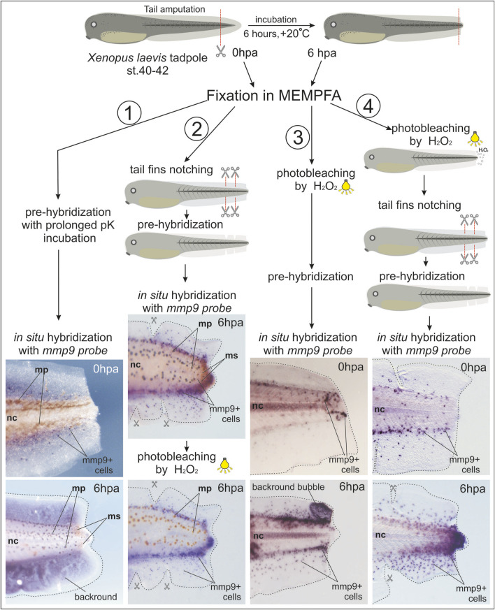 Whole-mount in situ hybridization (WISH) is a widely used method that supports the concept of "seeing is believing" by enabling the visualization of gene expression patterns in whole-mount multicellular samples or sections. This technique is essential in the study of epimorphic regeneration in cold-blooded vertebrates, where complex three-dimensional organs such as tails, limbs, and eyes are completely restored after loss. The tadpoles of the frog X. laevis serve as a convenient model for studying regeneration, as they can regenerate their tails within a week after amputation. Modern high-throughput sequencing methods have identified various cell populations involved in the regeneration process and determined the repertoire of genes activated during this time. Specifically, a population of reparative myeloid cells expressing mmp9 as a marker gene has been shown to be crucial for the initial stages of tail regeneration in X. laevis tadpoles. The validation of these data and further examination using WISH offers the advantage of providing detailed information on the spatial and temporal dynamics of target gene expression levels. However, detecting mRNA by WISH can be challenging when mRNA levels are very low, transcripts are localized in hard-to-access areas, or tissue samples are prone to background staining, as is the case with X. laevis regenerating tail samples. Here, we describe additional treatments for regenerating tail samples that minimize background staining and enhance the visualization of cells containing target RNA through in situ hybridization. Using an optimized WISH protocol on X. laevis tadpole tail regenerates, we obtained novel data on the mmp9 expression pattern during the first day post-amputation at the regeneration-competent stage 40 and the regeneration-incompetent stage 47 (refractory period). The significant differences in the expression patterns indicate that mmp9 activity is positively correlated with regeneration competence.