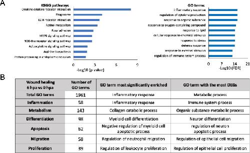 Fig. 2. KEGG and GO analyses reveal that conserved KEGG pathways/GO terms are regulated in wild-type and TRDKO tadpoles during wound healing. A Top 10 KEGG pathways/GO terms significantly enriched among the 243 DEGs common to all 4 groups (wild-type stage 56, wild-type stage 61, TRDKO stage 56 and TRDKO stage 61) during wound healing (6 hpa vs 0 hpa). Notably, the inflammatory response is the most significantly enriched pathways/terms. B The GO terms known to be involved in wounding healing were highly enriched among 243 DEGs common to all 4 groups