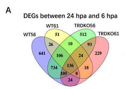 Fig. 1. Fewer differentially expressed genes (DEG) between 0 and 6 h postamputation (hpa) (the wound healing period) in the tail of wild-type tadpoles at the climax (stage 61) than in the other 3 groups of animals (wild-type at stage 56, TRDKO at stage 56 and TRDKO at stage 61). A Venn diagram of the DEGs identified in the wild-type and TRDKO tail at stage 56 and stage 61 during wound healing period. Note that there were 566 DEGs at wild-type stage 61 compared to 1162 DEGs at wild-type stage 56, 1171 DEGs at TRDKO stage 56 and 1134 DEGs at TRDKO stage 61. B Volcano plots showing the up (red)- and down (blue)-regulated DEGs in the wild-type and TRDKO tail at premetamorphosis (stage 56) and metamorphic climax (stage 61) during wound healing