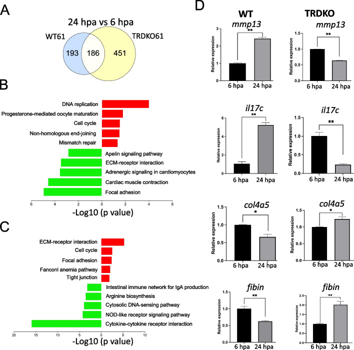 Fig. 4. The expression of genes related to ECM-receptor interaction pathway is increased and that of genes involved in cytokine-cytokine receptor interaction pathway is reduced during the blastema period of regeneration in TRDKO tail at stage 61, the opposite to that in wild-type tail at stage 61. A Venn diagram of the DEGs in wild-type and TRDKO tail at stage 61 during the blastema period of regeneration. Note that there were more DEGs in the tail of TRDKO tadpoles than wild-type (WT) tadpoles. B/C Top 10 KEGG pathways significantly enriched among the 81 upregulated (pathways in red) or 112 downregulated (pathways in green) genes specific to WT tail (B) and the 219 upregulated (pathways in red) and 232 downregulated (pathways in green) genes specific to TRDKO tail (C). D Validation of the known inflammatory genes (mmp13, il17c) and ECM genes (col4a5, fibin) by RT-qPCR, normalized to that of rpl8
