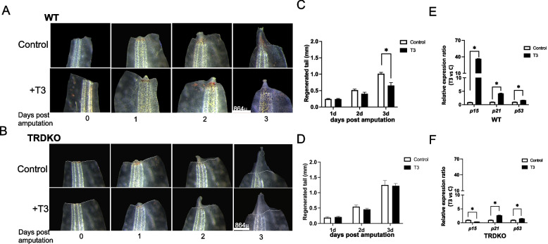 Fig. 6. T3 treatment inhibits tail regeneration in wild-type tadpoles but not in TRDKO tadpoles at stage 56. A/B Morphological observations during tail regeneration in wild-type (A) and TRDKO (B) tadpoles showed that T3 treatment at stage 56 inhibited the regeneration compared to -T3 control, particularly at 3 days after tail amputation of wild-type while not TRDKO animals. The white dashed lines indicated amputation sites. Scale bar: 864 μm. C/D Quantitative analyses of the length of the regenerated tail in the wild-type (C) and TRDKO (D) tadpoles revealed that T3 treatment significantly decreased the regenerated length at 3 days post amputation in wild-type but not TRDKO animals. The data were shown as mean values of at least 3 replicates with SE. *P < 0.05. E/F Differential regulation of cellular senescence marker genes, p15, p21 and p53, by T3 in WT56 and TRDKO56 animals during regeneration. Total RNA was isolated from regenerating tail of WT56 (E) and TRDKO56 (F) animals in the presence or absence of T3 for 3 days and analyzed by RT-qPCR for the expression of p15, p21 and p53. The expression level was normalized to that of rpl8, with the expression in the absence of T3 set to 1 for each gene. Each bar represents the mean plus S.E. and the asterisk (*) indicates a significant difference between the level of wild-type and TRDKO with (T3) or without T3 (Control) treatment (P < 0.05)