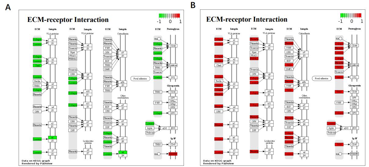 Fig. S3. The regulation of genes in the ECM-receptor interaction pathway in nonregenerative (A) and regenerative animals (B) during blastema