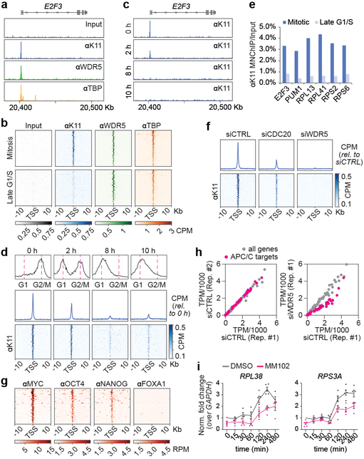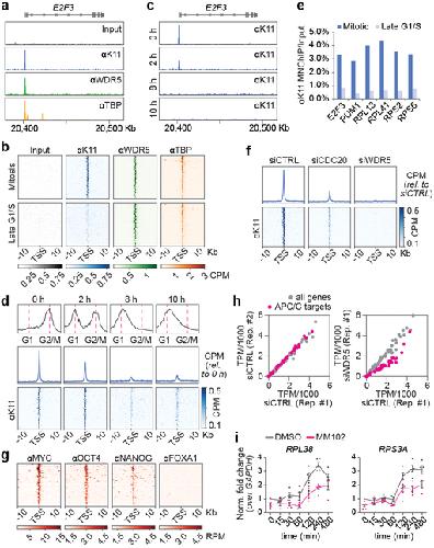 Metazoan development requires the robust proliferation of progenitor cells, the identities of which are established by tightly controlled transcriptional networks1. As gene expression is globally inhibited during mitosis, the transcriptional programs that define cell identity must be restarted in each cell cycle2-5 but how this is accomplished is poorly understood. Here we identify a ubiquitin-dependent mechanism that integrates gene expression with cell division to preserve cell identity. We found that WDR5 and TBP, which bind active interphase promoters6,7, recruit the anaphase-promoting complex (APC/C) to specific transcription start sites during mitosis. This allows APC/C to decorate histones with ubiquitin chains branched at Lys11 and Lys48 (K11/K48-branched ubiquitin chains) that recruit p97 (also known as VCP) and the proteasome, which ensures the rapid expression of pluripotency genes in the next cell cycle. Mitotic exit and the re-initiation of transcription are thus controlled by a single regulator (APC/C), which provides a robust mechanism for maintaining cell identity throughout cell division.