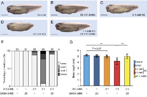 . (A-E) Effects of AG and GABA treatments on embryos from St. 18 to 38. Scale bars: 1 mm.