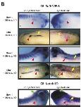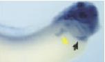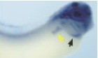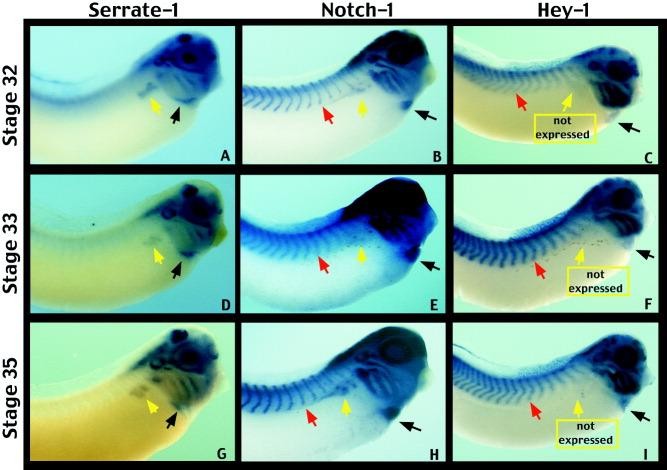 Figure 3. Later expression of the Xenopus orthologue of the hairy related gene (XHey-1) in comparison to Notch-1 and Serrate-1. XHey-1 expression persists in the somites (red arrows), head, eyes, and branchial arches of tadpole stage embryos shown from stages 32 to 35 (C,F,I). At this time, XHey-1 is also expressed in the heart (black arrows). Expression of Notch-1 and Serrate-1 is shown for comparison (A,B,D,E,G,H). Note that XHey-1 is expressed in a pattern largely overlapping that of Notch-1 and Serrate-1 in many tissues. However, unlike XHey-1, Notch-1, and Serrate-1 are expressed in the developing pronephros at this time (yellow arrows). In all panels, embryos are viewed laterally, with anterior to the right. |