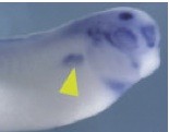 jag1 (jagged 1)gene expression in Xenopus laevis embryo via in situ hybridization, NF stage 32, lateral view, anterior right, dorsal up, head and trunk region only.