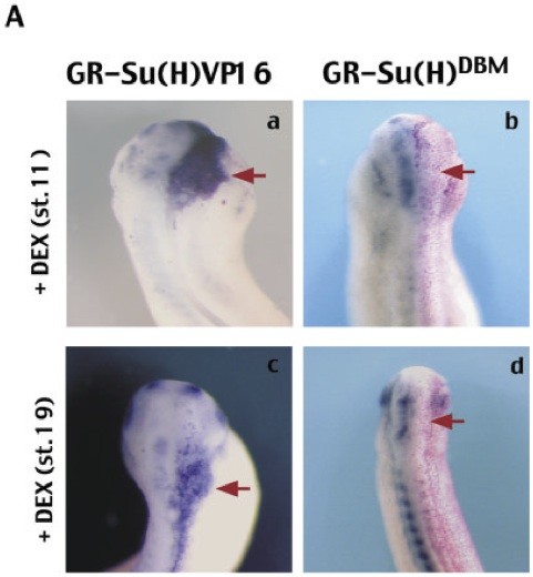 Fig. 4. Xenopus orthologue of the hairy related gene (XHey-1) is responsive to Notch signaling in the developing brain and pronephros. Embryos were injected with either GR-Su(H)VP16, GR-NotchICD, or GR-Su(H)D B M and induced with dexamethasone either early (between stages 11 and 13) or late (between stages 15 and 19). Injected embryos were cultured, fixed between stages 24 and 30, and processed for in situ hybridization. A: In the developing brain, XHey-1 is responsive to Notch signaling (between stages 11 and 19) independently of when signaling is perturbed. Activation of Notch signaling increases expression of XHey-1 on the injected side of the head [dark orange arrows; a,c; also see 4B (i,j)], whereas suppression of Notch signaling decreases expression of XHey-1 on the injected side of the embryo (dark orange arrows; b,d). B,C: In the pronephros, XHey-1 is responsive to Notch signaling; however, this responsiveness is sensitive to the time of induction of the injected con-