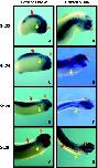 Fig. 4. Xenopus orthologue of the hairy related gene (XHey-1) is responsive to Notch signaling in the developing brain and pronephros. Embryos were injected with either GR-Su(H)VP16, GR-NotchICD, or GR-Su(H)D B M and induced with dexamethasone either early (between stages 11 and 13) or late (between stages 15 and 19). Injected embryos were cultured, fixed between stages 24 and 30, and processed for in situ hybridization. B: Early activation of Notch signaling decreased both the expression of Lim-1 throughout the entire pronephric field (c,d) as well as the expression of Hey-1 (a,b). Activation of Notch signaling later, after the establishment of the initial Lim-1 pronephric field, decreases expression of only the duct domain of Lim-1 (g,h) while expanding the anterior expression of XHey-1 (c,d, and i,j). |