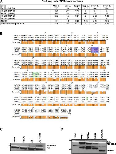 Figure 1—figure supplement 1. Progesterone receptors in Xenopus oocytes.(A) Table representing the number of transcripts per million (TPM) of the different progesterone receptors in Xenopus laevis oocytes (Ooc. S., and Ooc.(L).), eggs (Egg S., and Egg L.), and the ovary. Being tetraploid, Xenopus laevis expresses two different versions of each gene; S and L. the data are retrieved from Xenbase. (B) Alignment of Xenopus laevis α/β hydrolase domain-containing protein 2 (ABHD2).L and ABHD2.S amino acids sequences with human ABHD2. Residues implicated in the lipase activity of ABHD2 are highlighted in green, whereas the acetyltransferase domain is highlighted in purple. (C) Representative western blot (WB) of mPR-GFP proteins expression in naïve, control antisense (Ctrl AS), ABHD2 antisense (AS), and AS +mPR GFP injected oocytes. Tubulin is shown as a loading control. (D) Representative WB of ABHD2.S protein expression levels in naïve oocytes and in oocytes injected with mRNA to overexpress ABHD2 wildtype (WT), ABHD2.S S207A, ABHD2.S S207A/D345A/H376A (S/D/H). Tubulin is shown as a loading control.