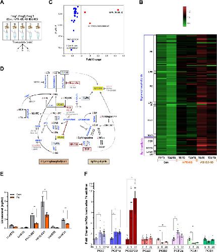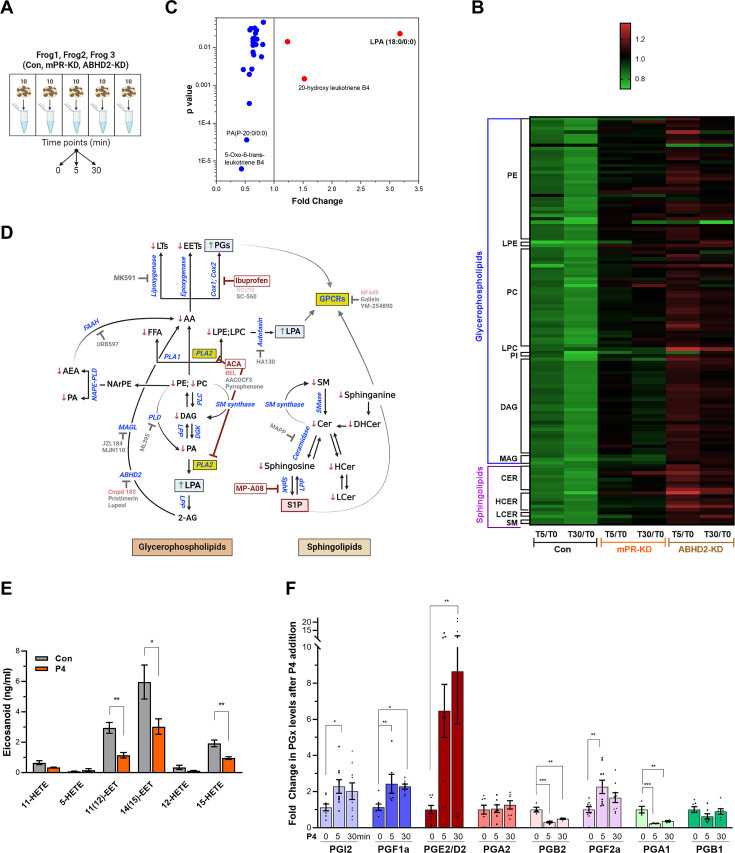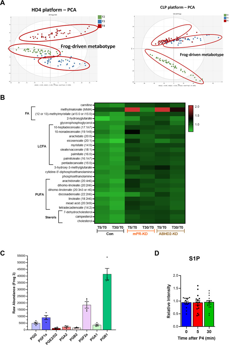 Figure 2—figure supplement 1. Metablomics profiles during oocyte maturation.(A) Frog-driven metabotype as shown from the HD4 (left panel) and CLP platforms (right panel). (B) Data generated from the HD4 platform illustrated by the heatmap data of fold changes for individual metabolites that were changed significantly (p<0.05) at either the 5 min (T5) or 30 min (T30) time points in response to P4 as compared to untreated oocytes (T5/T0 and T30/T0) for naive (Con), mPR-KD, and ABHD2-KD oocytes. Metabolites are clustered at the levels of fatty acids (FA), long-chain fatty acids (LCFA), polyunsaturated fatty acids (PUFA), and sterols. (C) The raw abundance of individual prostaglandin species in pooled oocytes before treatment from a representative frog (#3) to illustrate relative abundance among the different PG species. (D) S1P measurements in pooled oocytes before treatment, and at 5 and 30 min after progesterone addition. The data are shown as relative intensity normalized to the average of before-treatment levels. |