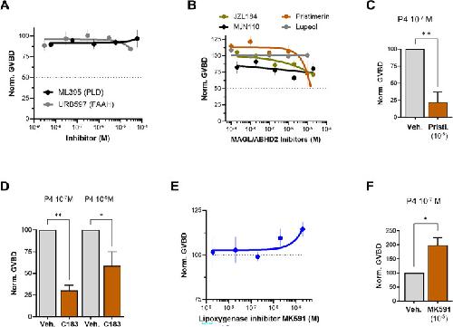 Figure 3—figure supplement 1. Effects of various pharmacological inhibitors on oocyte maturation.(A, B, E) Oocyte maturation inhibition dose-response.Oocytes were pre-treated for 2 hr with vehicle or with a increasing concentrations of specified inhibitor, followed by overnight treatment with progesterone (P4) at 10–5M. Oocyte maturation normalized to vehicle P4-treated oocytes. IC50 of each chemical compound was calculated using a nonlinear regression fit (mean ± SEM; n=3 independent female frogs for each chemical compound experiment). (C, D, F) Effect of pristimerin (C), compound 183 (10–4 M) (D), and MK591 (F) on oocyte maturation at the indicated P4 concentration. Oocytes were pre-treated for 2 hr with the vehicle or indicated inhibitor, followed by overnight treatment with P4. Oocyte maturation was normalized to the control oocyte condition (treated with vehicle) (mean ± SEM; n=3 independent female frogs for each chemical compound experiment, unpaired t-test). |