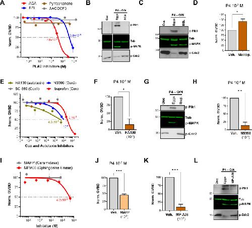 Figure 3. Pharmacological validation of the metabolomics findings.(A, E, I) Dose-response of inhibition of oocyte maturation for the drugs tested. Oocytes were pre-treated for 2 hr with a vehicle or with increasing concentrations of the indicated drugs, followed by overnight treatment with progesterone (P4) at 10–5 M. IC50 was calculated using a nonlinear regression fit (mean ± SEM; n=3 independent female frogs). (D, F, H, J, K) Drug effect on oocyte maturation at low P4 concentration. Oocytes were pre-treated for 2 hr with the vehicle or with the highest drug concentration from the dose-response, followed by overnight treatment with P4 at 10–7 M. Oocyte maturation was normalized to control oocytes (treated with vehicle) (mean ± SEM; n=3 independent female frogs for each chemical compound experiment, unpaired t-test). (B, C, G, L) Representative WB of MAPK, Plk1, and Cdc2 phosphorylation from untreated oocytes, oocytes pretreated with vehicle or the indicated drug for 2 hr then matured overnight (O/N) with P4 (eggs). Tubulin is shown as a loading control.