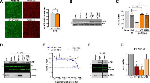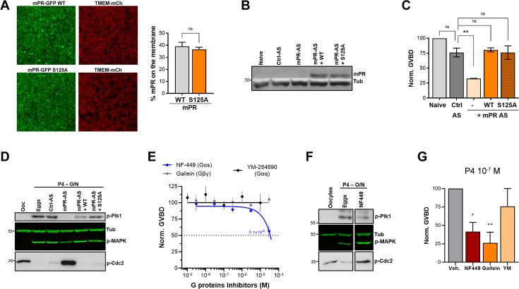 Figure 4—figure supplement 1. Role of GPCR signaling.(A) mPR S125 plasma membrane localization. Oocytes were injected with mPR-GFP wild-type (WT) or the S125A mutant, along with TMEM-mCherry as a plasma membrane (PM) marker. Left panel, Representative confocal image of oocytes overexpression mPR-GFP WT or mPR-GFP S125A mutant along with TMEM-mCherry. Right panel, histogram showing the percentage of mPR-GFP WT or mPR-GFP S125A at the PM (mean ± SEM; n=10 oocytes per clone from two independent female frogs, unpaired t-test). (B) Representative WB of mPR-GFP protein expression in naïve, control antisense (Ctrl AS), mPRβ antisense (AS), and AS +mPR GFP WT or mPR-GFP S125A mutant injected oocytes. Tubulin is shown as a loading control. (C) Oocyte maturation in oocytes injected with control antisense (Ctrl AS) or mPRβ antisense (AS) with or without mPR-GFP WT or mPR-GFP S125A expression, and normalized to progesterone (P4)-treated naïve oocytes (Naive) (mean ± SEM; n=3 independent female frogs, ordinary one-way ANOVA). (D) Representative WB of MAPK, Plk1, and Cdc2 phosphorylation from untreated oocytes, P4 matured eggs, oocytes injected with control antisense (Ctrl AS) or mPRβ antisense (AS) with or without mPR-GFP WT or mPR-GFP S125A expression. Tubulin is shown as a loading control. (E) Inhibitor dose response. Oocytes were pre-treated for 2 hr with vehicle or with increasing concentrations of specified inhibitor, followed by overnight treatment with P4 at 10–5 M. Oocyte maturation normalized to vehicle P4-treated oocytes. IC50 was calculated using a nonlinear regression fit (mean ± SEM; n=3 independent female frogs for each chemical compound experiment). (F) Representative WB of MAPK, Plk1, and Cdc2 phosphorylation from untreated oocytes, oocytes pretreated with a vehicle for 2 hr then matured overnight (O/N) by P4 at 10–7 M (eggs), and oocytes pretreated for 2 hr with NF449 then treated O/N with P4 10–7 M. Tubulin is shown as a loading control. (G) Drug effect on oocyte maturation at low P4 concentration. Oocytes were pre-treated for 2 hr with vehicle or the specified inhibitor followed by overnight treatment with P4 at 10–7 M. Oocyte maturation was normalized to the control oocytes condition (treated with vehicle) (mean ± SEM; n=3 independent female frogs for each chemical compound experiment, unpaired t-test).