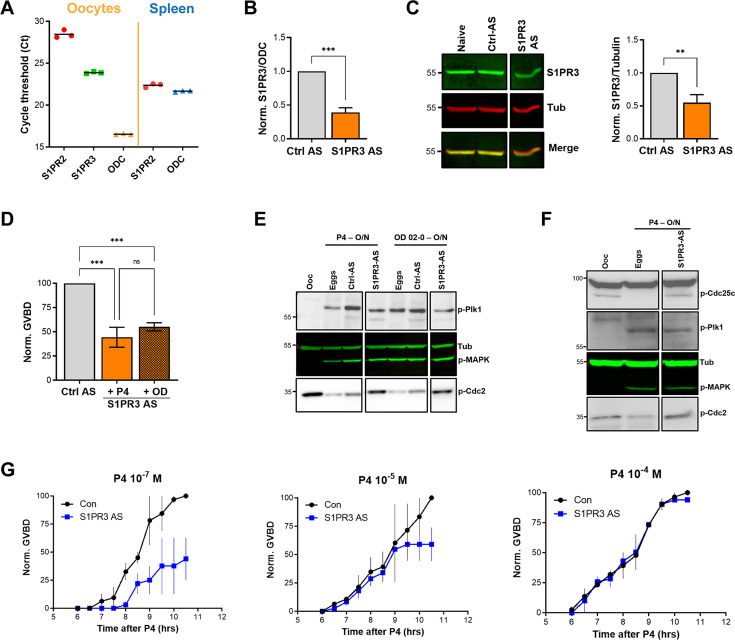 Figure 4. S1P signaling and oocyte maturation.(A) mRNAs levels of S1PR2, S1PR3, and the housekeeping gene Ornithine decarboxylase (ODC) in oocytes and spleen measured as the Cycle threshold (Ct) from real-time PCR. (B–C) S1PR3 knockdown. Oocytes were injected with control antisense (Ctrl AS) or specific S1PR3 antisense oligonucleotides and incubated at 18 °C for 24 hr. RNAs and protein extracts were prepared and analyzed by RT-PCR and western blot (WB) to determine the efficacy of S1PR3 knockdown as compared to control oocytes (Ctrl AS). B. Histogram showing the relative RNAs levels of S1PR3 mRNA to xODC. (C) Representative WB (left panel) and normalized quantification (right panel) comparing S1PR3 protein levels between naïve, Ctrl AS and S1PR3 AS injected oocytes. Tubulin is shown as a loading control (mean ± SEM; n=6 independent female frogs). (D) Oocyte maturation following injection of S1PR3 antisense, normalized to progesterone (P4) or Org OD 02–0 (OD)-treated oocytes injected with control antisense (Ctrl AS) (mean ± SEM; n=7 independent female frogs, ordinary one-way ANOVA). (E/F) Representative WBs of MAPK, Plk1, and Cdc2 (E), as well as CDC25C (F) phosphorylation from untreated oocytes, P4 or OD, matured eggs (O/N)D, oocytes injected with control antisense (Ctrl AS) or S1PR3 antisense (S1PR3 AS) and treated O/N with P4 or OD. Tubulin is shown as a loading control.(G) GVBD-time course after treatment with P4 at the indicated concentrations in oocytes injected with water (Con) or with S1PR3 antisense (S1PR3 AS) (mean ± SEM; n=2 independent female frogs).