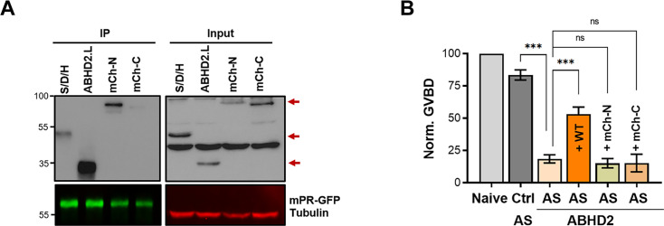 Figure 5—figure supplement 1. ABHD2 mutants interaction with mPRβ.(A) Representative western blot (WB) of the immunoprecipitation (IP) of mPR-GFP using lysates from oocytes over-expressing mPR-GFP with α/β hydrolase domain-containing protein 2 (ABHD2). L, mCherry tagged ABHD2.S at its C-terminal (mCh-C) or N-terminal (mCh-N), and ABHD2.S S/D/H. The input represents expression levels of the different clones before the IP. Tubulin is shown as a loading control. The red arrows point to ABHD2.S different clones. (B) Oocyte maturation measured in oocytes injected with control antisense (Ctrl AS) or ABHD2 antisense (AS) with or without ABHD2.S wild type (AS +WT) or the mCherry tagged ABHD2.S clones and normalized to progesterone (P4)-treated naïve oocytes (Naive) (mean ± SEM; n=3–5 independent female frogs, ordinary one-way ANOVA).