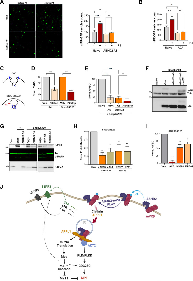 Figure 6. α/β hydrolase domain-containing protein 2 (ABHD2) and phospholipase A2 (PLA2) activity are required for membrane progesterone receptor β (mPRβ) endocytosis and signaling.(A) Effect of ABHD2 knockdown on mPR-P4 mediated endocytosis. Oocytes were injected with mPR-GFP RNA (Naïve) and 48 hr later either left untreated or injected with ABHD2 antisense (ABHD2 AS). The following day oocytes were imaged, before and 45 min after progesterone (P4) treatment. Left panel, representative confocal image of mPR-GFP positive vesicles in naïve and ABHD2 AS oocytes, before and after P4. Right panel, histogram of mPR-GFP positive vesicle count before and after P4 (mean ± SEM; n=20–21 oocytes per condition, from three independent female frogs, ordinary one-way ANOVA). (B) PLA2 inhibition blocks P4-mediated endocytosis. Vesicle count from oocytes expressing mPR-GFP for 72 hr was pretreated with vehicle (naïve) or ACA for 2 hr, followed by imaging, before and 45 min after P4 treatment (mean ± SEM; n=16–18 oocytes per condition, from two independent female frogs, ordinary one-way ANOVA). (C) Cartoon depicting the role of SNAP25Δ20 in blocking exocytosis. (D) SNAP25Δ20-induced oocyte maturation requires clathrin-dependent endocytosis. Naïve oocytes were pretreated with vehicle or Pitstop (10–5 M), followed by overnight treatment with P4 or SNAP25Δ20-mRNA injection. Oocyte maturation in P4 or SNAP25Δ20 injected oocytes normalized to the vehicle condition (mean ± SEM; n=4 independent female frogs, ordinary one-way ANOVA). (E) SNAP25Δ20-induced maturation requires ABHD2. Oocytes were injected with mPR antisense (mPR AS) or ABHD2 antisense (AS) with or without mPRβ mRNA (AS +mPR). 48 hr later, oocytes were injected with mRNA to overexpress SNAP25Δ20. The following day, oocyte maturation was measured in mPR AS, ABHD2 AS, and ABHD2 AS +mPR oocytes normalized to naive oocytes injected with SNAP25Δ20 (mean ± SEM; n=3 independent female frogs, ordinary one-way ANOVA). (F) Representative WB of mPR and SNAP25Δ20 proteins expression in naïve, ABHD2 AS and ABHD2 AS +mPR oocytes. Tubulin is shown as a loading control. (G) Representative WB of MAPK, Plk1, and Cdc2 phosphorylation from untreated oocytes, P4 matured eggs, or SNAP25Δ20 mRNA injection, and oocytes injected with mPR (mPR AS) or ABHD2 antisense (ABHD2 AS) and treated O/N with P4 or SNAP25Δ20 mRNA injection. Tubulin is shown as a loading control. (H) Quantification of p-Plk as the ratio of p-PLK/Tubulin and p-MAPK as the ratio of p-MAPK/Tubulin normalized to the ratios in naive eggs (mean ± SEM; n=4 independent female frogs, ordinary one-way ANOVA). (I) Oocyte maturation in oocytes pretreated for 2 hr with ACA, NS398, and MP-A08 followed by SNAP25Δ20-mRNA injection and normalized to GVBD in oocytes pre-treated with vehicle followed by SNAP25Δ20-mRNA injection (Veh.) (mean ± SEM; n=3 independent female frogs, ordinary one-way ANOVA). (J) Model of the signaling cascade triggered in response to P4 (generated using Biorender).