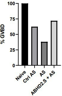 Author response image 1. ABHD2 knockdown and rescue.Oocytes were injected with control antisense (Ctrl AS) or specific ABHD2 antisense (AS) oligonucleotides and incubated at 18 oC for 24 hr. Oocytes were then injected with mRNA to overexpress ABHD.S for 48 hr and then treated with P4 overnight. The histogram shows % GVBD in naïve, oocytes injected with control or ABHD2 antisense with or without mRNA to overexpress ABHD2.S. |