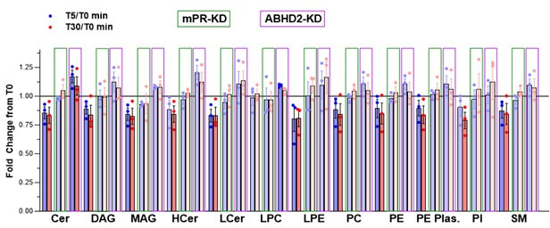 Author response image 2. Metabolite levels from 5 replicates of 10 oocytes each at each time point were measured and averaged per frog and per time point.Fold change was measured as the ratio at the 5- and 30-min time points relative to untreated oocytes (T0). FCs that are not statistically significant are shown as faded. Oocytes with mPR knockdown (KD) are boxed in green and ABHD2-KD in purple. |