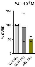 Author response image 3. The effect of MJN110 and JZL184 compounds on oocyte maturation at low P4 concentration.Oocytes were pre-treated for 2 hours with the vehicle or with the highest concentration of 2.10--5 M for both JZL184 or MJN110, followed by overnight treatment with P4 at 10-7M. Oocyte maturation was measured as % GVBD normalized to control oocytes (treated with vehicle) (mean + SEM; n = 2 independent female frogs for each compound). |