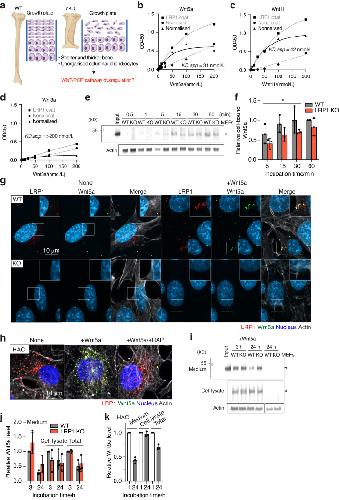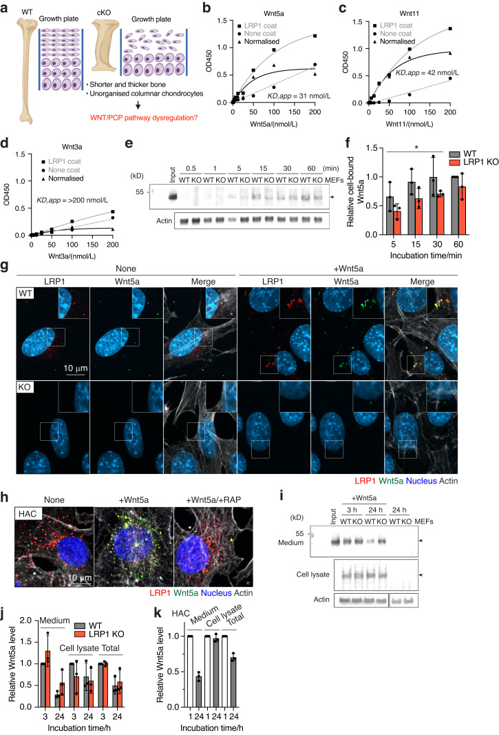 Fig. 6. LRP1 mediates endocytosis of Wnt5a, a core non-canonical WNT/planar cell polarity (PCP) pathway component. a Schematic diagram illustrating the long bone phenotype of Lrp1flox/flox/Prrx1Cre mice. Full-length sLRP1 was coated onto microtiter plates and the binding of 0–200 nmol/L Wnt5a (b), Wnt11 (c), Wnt3a (d) was measured using specific antibody for each Wnt as described under “Materials and Methods”. Mean values of technical duplicates for none-coating, LRP1-coating and after normalisation were shown as circles, squares and triangles, respectively. Extrapolated KD,app values were estimated based on one-phase decay nonlinear fit analysis (black lines). WT and LRP1 KO MEFs (n = 3) were incubated with 40 nmol/L Wnt5a for 0.5–60 min and Wnt5a in the cell lysate was detected by Western blotting (e). The relative amount of Wnt5a was expressed by taking the amount of Wnt5a after 60-min incubation as 1 (f). Circles represent individual mice and bars show the mean ± Svalues for the amount of Wnt5a after incubation for 5–30 min in WT versus LRP1 KO MEFs were evaluated by two-way ANOVA. *P < 0.05. Representative images of confocal microscopy analysis for Wnt5a and LRP1 in WT and LRP1 KO MEFs (n = 3) (e) or human normal chondrocytes (n = 3) f Cells were incubated with 20 nmol/L Wnt5a for 3 h in the absence (g, h) or presence of 500 nmol/L RAP (h). Wnt5a, LRP1, cytoskeleton and nucleus were visualised as described under “Materials and Methods”. Scale bar, 10 µm. Regions delineated by the white squares in the panels have been magnified in the top right (g). WT and LRP1 KO MEFs (n = 3) were incubated with 20 nmol/L Wnt5a for 3–24 h and Wnt5a in the medium and cell lysate were detected by Western blotting (i). Densitometric analysis of immunoreactive Wnt5a bands was carried out. The relative amount of Wnt5a in the media, cell lysate and both media and cell lysate (total) were expressed by taking the amount of Wn5a after 3-h incubation in WT MEFs as 1 (j). k human normal chondrocytes (n = 3) were incubated with 20 nmol/L Wnt5a for 1–24 h and analysed as in a and b. The relative amount of Wnt5a after 24-h incubation was expressed by taking the amount of Wn5a after 1-h incubation as 1. Circles represent individual experiment and bars show the mean ± SD |