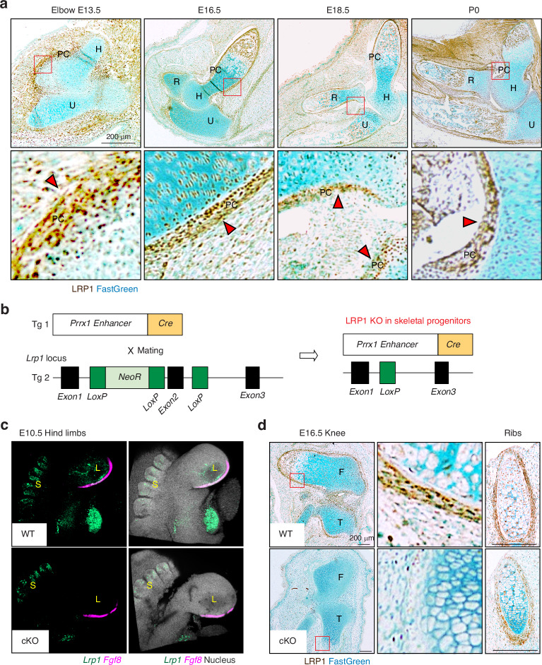 Fig. 1. LRP1 is abundantly expressed in skeletal progenitor cells, in particular in the perichondrium. a Representative images of immunohistochemical staining of LRP1 and fast green counterstaining in WT E13.5-P0 elbow joint sections of Lrp1flox/flox mice. Scale bar, 200 µm. H, humerus; R, radius; U, ulna; PC, perichondrium. Regions delineated by the red squares in the panels have been magnified in the lower panels. Arrow heads indicate abundant LRP1 expression in perichondrium layers. b Schematic diagram showing the constructs used to generate skeletal progenitor-selective LRP1 conditional knockout mice. Transgenic mouse lines harbouring Prrx1 limb enhancer Cre (Tg 1) and floxed Lrp1 (Tg 2) were used to establish the Lrp1flox/flox/Prrx1Cre line. c In situ hybridisation chain reaction for Lrp1 and Fgf8 mRNA expression in E10.5 hind limbs of WT and Lrp1flox/flox/Prrx1Cre homozygote conditional KO (cKO) mice. Lrp1 and Fgf8 were visualised as described under “Materials and Methods”. L, bulging limb bud; S, somite. d Representative images of immunohistochemical staining of LRP1 and fast green counterstaining in E16.5 knee and rib sections of WT and Lrp1flox/flox/Prrx1Cre homozygote conditional KO (cKO) mice. Regions delineated by the red squares in the upper panels have been magnified in the lower panels. Scale bar, 200 µm. F, femur; T, tibia |