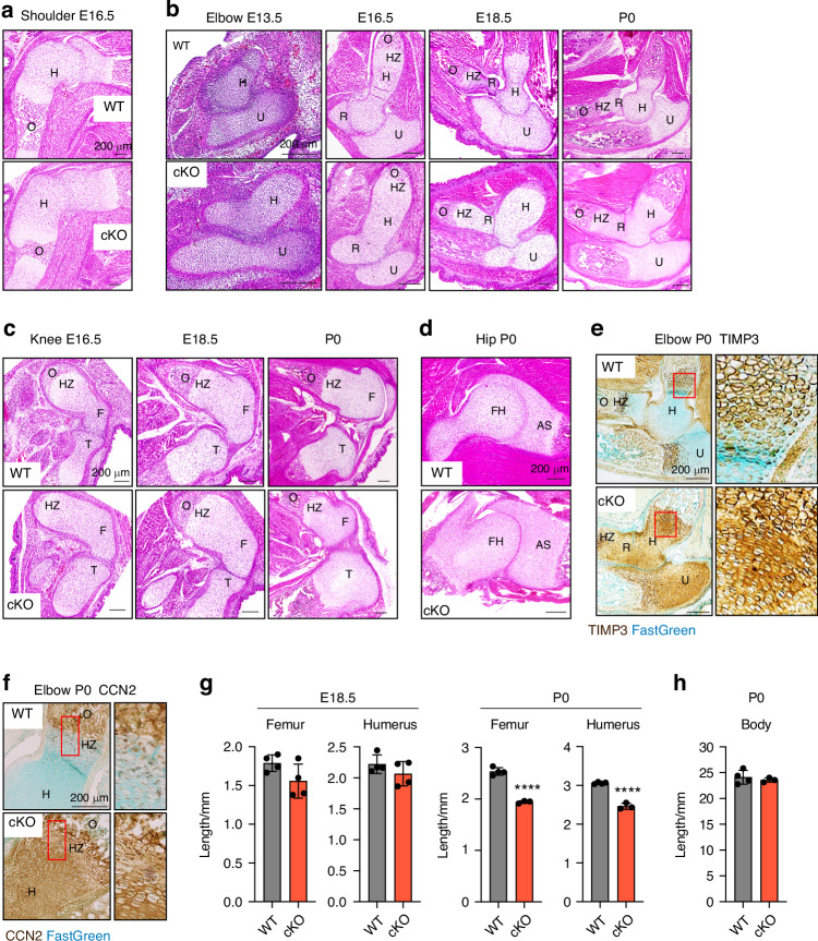 Fig. 2. Conditional deletion of Lrp1 in skeletal progenitors impairs early bone and joint formation. Representative images of H&E staining of E16.5 shoulder (a), E13.5-P0 elbow (b), E16.5-P0 knee (c) and P0 hip (d) sections of WT and Lrp1flox/flox/Prrx1Cre homozygote conditional KO (cKO) mice. Scale bar, 200 µm. H, humerus; R, radius; U, ulna; HZ, hypertrophic zone; O, primary ossification centre; F, femur; FH, femur head; T, tibia; AS, acetabulum socket. e and f, Representative images of immunohistochemical staining of TIMP3 (e) and CCN2 (e) and fast green counterstaining in E16.5 knee sections of WT and cKO mice. Regions delineated by the red squares in the panels have been magnified in the right panels. Scale bar, 200 µm. g and h, Length of femur and humerus mineralised bone (g) and body (h) of E18.5 (g) and P0 (gand h) WT and cKO mice. Circles represent individual mice and bars show the mean ± SD. P values were evaluated by 2-tailed Student’s t test. ****P < 0.000 1 |